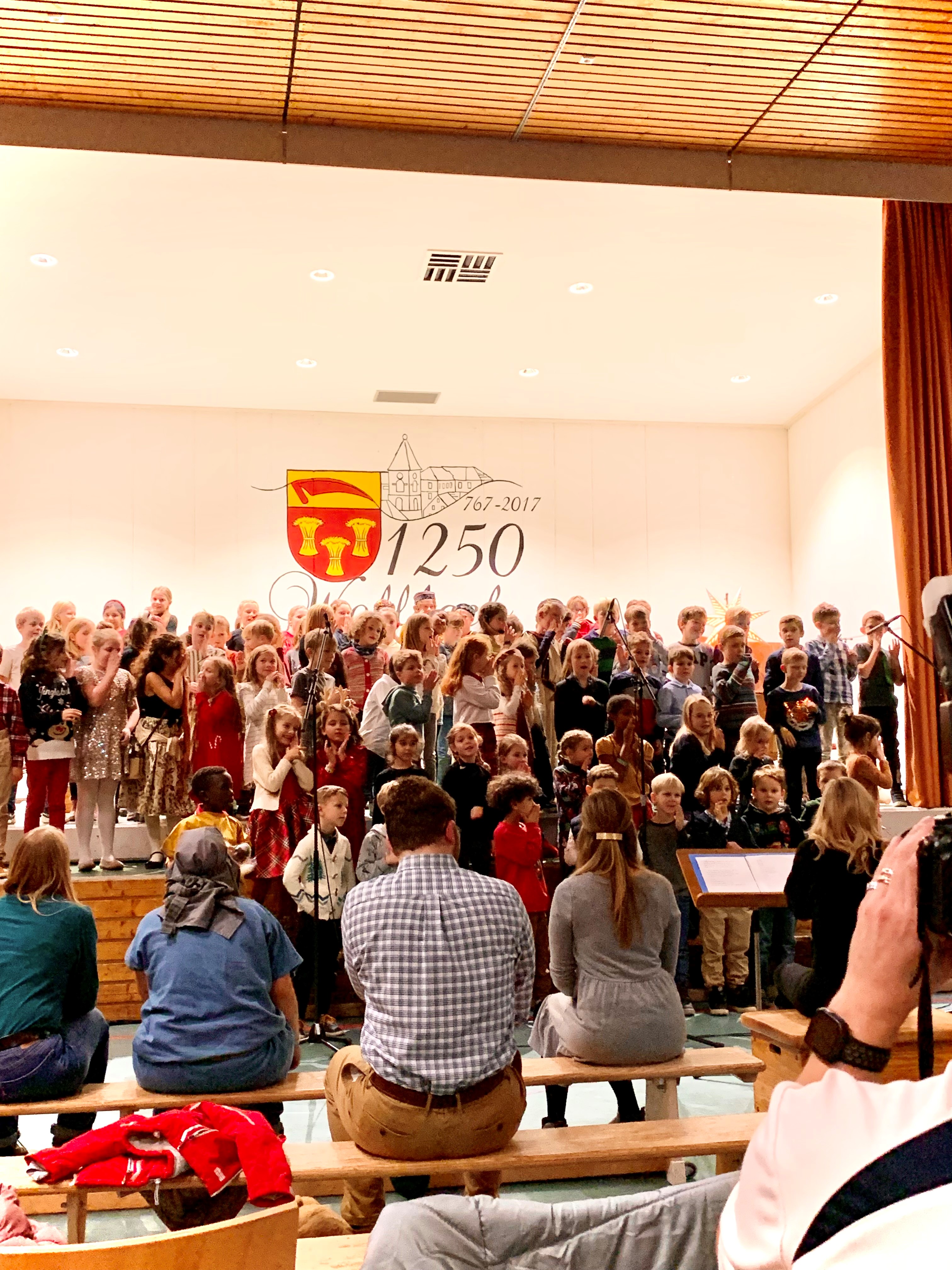 Schon zu Beginn lag Vorfreude in der Luft: In der Sporthalle, die zum Saal mit Bühne umgebaut war, schmückten selbstgebastelte Sterne die Fenster, in den vorderen Reihen warteten aufgeregte Grundschüler auf den Beginn, und im hinteren Teil der Halle lockten Plätzchen und Kekse für später.
